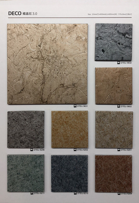 LG Hausys蝶晶石(Deco) 產(chǎn)品特點(diǎn):差別化表面設(shè)計(jì),紋路清晰,花色逼真;UV表面處理,耐污、耐磨性能較好;出眾的物理性能,尺寸穩(wěn)定性、直角度等;綠色環(huán)保,獲得國(guó)家環(huán)境標(biāo)志認(rèn)證;經(jīng)典花色,為各類空間提供豐富的設(shè)計(jì)選擇;不使用有害的鄰苯二甲酸酯(DOP);使用場(chǎng)所:辦公場(chǎng)所、金融系統(tǒng)、教育空間、公共商用等。