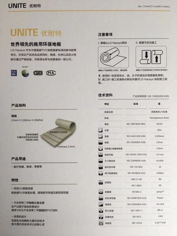 項(xiàng)目采用韓國LG Hausys優(yōu)耐特系列PVC地板,優(yōu)耐特系列為同質(zhì)透心地板。采用UV表面涂層,高密度PUR表面處理,提高耐污性能及耐刮劃性能,通過歐洲標(biāo)準(zhǔn)的耐磨測試(EN660-2)耐磨等級P及(groupP),不含鄰苯二甲酸脂及重金屬,生產(chǎn)過程不添加有害成分,使用100%不含鄰苯二甲酚酸酯的PVC材料。優(yōu)秀的設(shè)計(jì),雙底色與雙顆粒大理石紋技術(shù),大理石花紋技術(shù)以撫慰心靈,不含鄰苯二甲酸脂及重金屬,生產(chǎn)過程不添加有害成分, 使用100%不含鄰苯二甲酚酸酯的PVC材料。應(yīng)用場景:教育,醫(yī)院,購物中心。