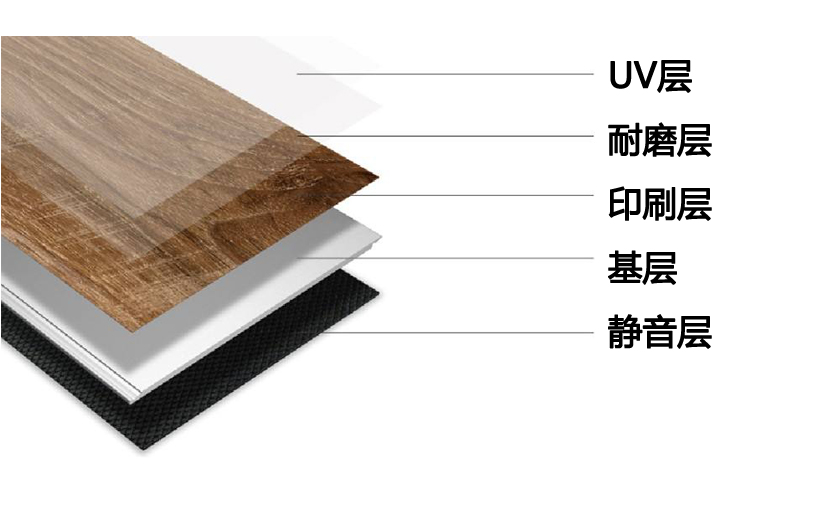 1.LVT地板的內部結構一般包括UV層,耐磨層,印刷層,LVT中底料層(一般中底料為三層LVT復合在一起)。通常為了提高地板的尺寸穩定性,在生產過程中還會在中底料層加玻璃纖維網,以降低地板因溫度變化引起的變形。