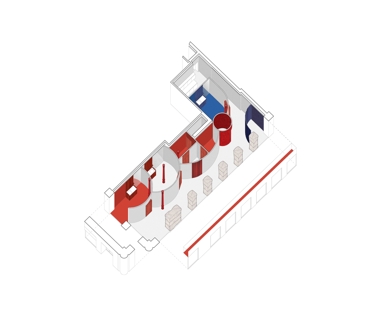通過花崗巖外立面向內望去,內部精致鮮艷的圓形隔斷間與外部灰色的方形石材形成鮮明對比。
